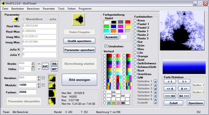 Willkommen zum WinITG 2.5.3, einem schnellen Mandelbrot- und Julia-Mengen-Berechnungsprogramm für Windows.
