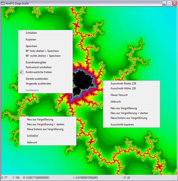 Im dargestellten Bild kann weiterhin mit der Maus eine Box gezogen werden, damit werden Koordinaten für eine eventuelle Vergrößerung des Fraktals zwischengespeichert. (Siehe auch Neu aus Vergrößerung und Parameter speichern aus Vergrößerung.) Nach loslassen der Maustaste erscheint ein Kontextmenü (Rahmen), in dem: