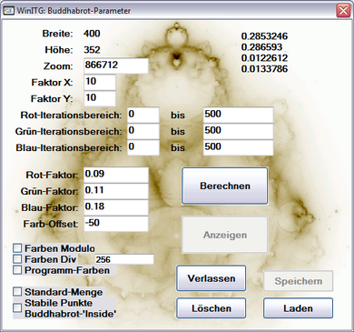 Neu in Version 2.4.1 ist die Buddhabrot-'inside'-Berechnung, also die der stabilen Punkte.
